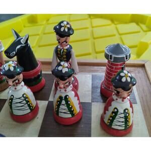 Hand Painted Folk Art Wooden Chess Set Complete Beautiful Eastern European. This is a stunning complete set some pieces have paint loss and little broken pieces (horses ears are broken) Each chess piece has a velvet bottom please look at all photos as they are part of the description. This set would be GREAT to play chess with. It comes with a folding wooden chess board. Condition is Used.