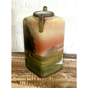 Bring home a beautiful piece of early Japanese export porcelain with this antique Hand Painted Nippon vase, made by the Morimura Brothers (later Noritake) between 1911 and 1921. This 6-inch vase features a softly blended landscape scene with trees at sunset, all meticulously hand painted. The squared body is accented by two geometric side handles, a classic Nippon-era design.