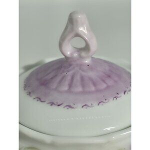 This elegant antique sugar bowl features delicate hand-painted florals and a soft purple lid. Its timeless charm and intricate detailing make it a unique addition to any collection or table setting. The dual handles and scalloped base enhance its sophisticated design. A beautiful piece that preserves the artistry of a bygone era.