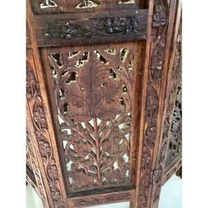 This stunning antique table base from India is a beautiful addition to any collection. With its octagonal (or square) shape and Moroccan style, it will make a stunning conversation piece in your home. It has eight hand carved sides, with each side hinged together, making it adjustable to a square base or octagonal base. Folds easily for shipping. Made of hand carved wood and measuring 17 1/2 inches in height and 13 inches in width when it is in the square position, and 14 1/2 inches wide when in the octagonal position.