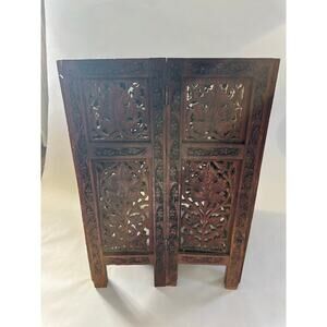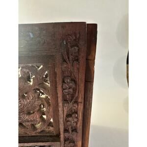 Add a lovely tray, marble or wood top. Carving is intricately detailed. There is one small knick in one of the panels near the top. It is not noticeable. It could be stained darker to match the wood, but definitely not necessary. This beautiful piece is in very good shape. Thanks….Lori
