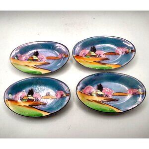 This set of four antique vintage Japanese trinket dishes salt cellars features hand-painted landscapes, showcasing traditional artistry. Crafted from porcelain, these oval plates display exquisite detail, adding an elegant touch to any collection or decor. Their vibrant colors and unique design reflect the rich cultural heritage of Japan.