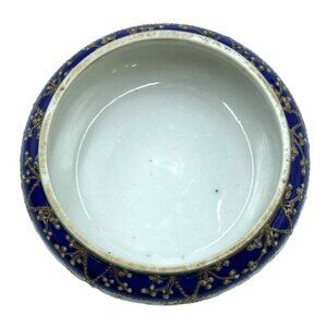 See pictures. Gold gilding starting to wear off. Wear to top edge -- may be from missing lid, but unsure if this originally came with a lid.