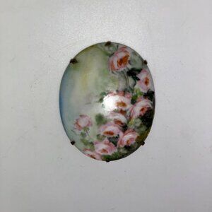 This antique brooch features a delicate hand-painted design of pink roses on porcelain, set against a soft pastel background, showcasing antique elegance.