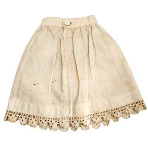 Charming antique doll underskirt from around 1880-1910, made of lightweight cotton muslin with hand crocheted lace trim and a small shell button at the waist. About 7 inches long, fits 16–20 inch dolls.