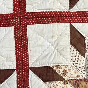 Hand quilted star quilt measures approx 88" x 82". The edging has been machine sewn, possibly repaired? Staining, fading and some wear, please refer to photos.