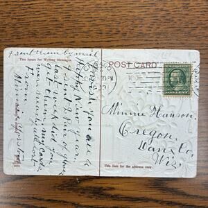 - Purple flowers and a pastoral scene that includes a windmill, house and a small flock of livestock. Gold edge with green leaves and white berries. "Good Luck in the New Year" Posted to Wisconsin in 1909 with stamp.