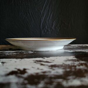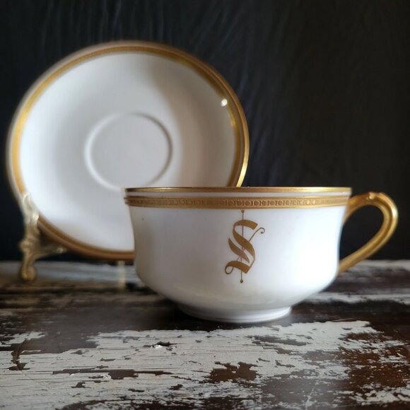 A French cup and saucer from Limoges, featuring refined gold detailing and monogrammed initial "S" for timeless sophistication.