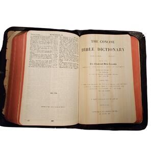Antique Holy Bible Self Pronouncing Teacher’s Edition Concordia St Louis 1923. Includes a bible dictionary and concordance in the back. The binding and cover has significant damage, all of which can be seen in the photos. This Bible is 100 years old and in decent preowned & vintage condition. There is some writing on the first couple pages but the scripture pages are not marked up or highlighted. Bible is sold as is seen in pictures. Please message with any questions before purchasing. Thanks for looking.