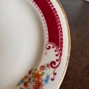 Beautiful Antique Homer Laughlin plates. Made in the 1940s in the USA. They are cream colored with multi-colored bouquets set between deep maroon designs and have gold around plate edge. The pattern may be called “Red Lady Alice” pattern. There are various ‘production’ letter and numbers on the back of each plate. They are in Good Antique condition. Gold is wearing away around the edges and one plate has a couple chips on the edge. Please zoom in on photos to see condition. They are 6.25” in diameter. Very sweet plates! Price is for 4 plates. A total of 8 plates are available.