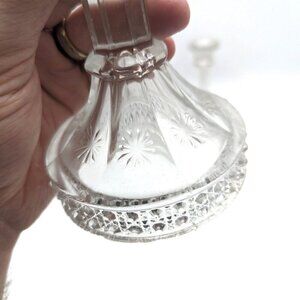 Beautiful antique pair of pressed glass taper candlesticks from Imperial Glass. Early 20th century. One is pristine, the other has one very small chip on the outer edge (see photos). Cool starburst pattern.