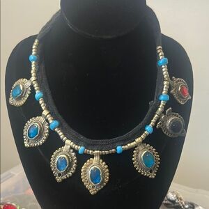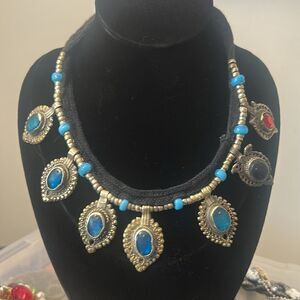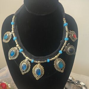 Antique INDIA Tribal Brass and Colored Glass Dangle Necklace