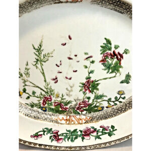 Antique Indian Tree Large 14.5" x 11.5" Oval Serving Platter Unmarked Late 19th Century. Unmarked. Any help identifying the maker is appreciated. No chips, no cracks. Does have wear and loss of color on design. Stains on back. Please view photos. Asian design. Cottagecore. Farmhouse.