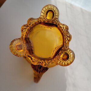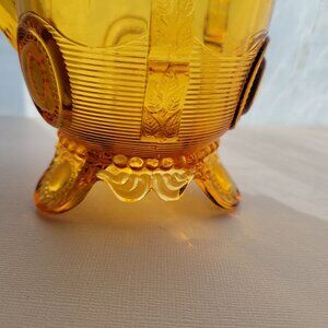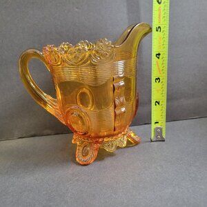 This vintage glass pitcher showcases intricate floral and geometric patterns, offering a touch of elegance to any table setting. The warm amber hue complements its ornate design, making it both a functional piece and a collectible for glassware enthusiasts.