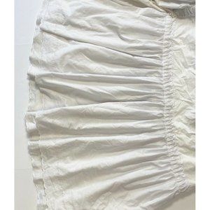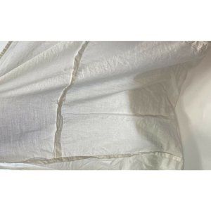 A beautifully-detailed textile in a solid white hue. This piece measures 48 x 68 inches on the interior rectangular portion, with a 26" drop all the way around the piece that features intricate, embroidered details and lace. Scalloped hem. Drawstring tie around the top of the skirted portion. Handmade. Split corners.