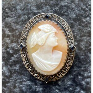 Antique Italian Shell Cameo Sterling Silver Pin or Pendant 4 Tiny Sapphires