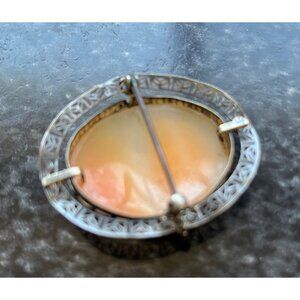 Antique shell cameo sterling silver pin or pendant, circa 1915-20. This shell cameo is set in a sterling silver frame with marcasite accents. The cameo may be worn as a pin or a pendant.