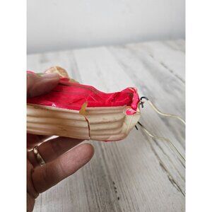 It's about 3.5 in tall by 12 in by 2 in, deer missing antlers, they're bent in on the body, sleigh is damage on the bottom and a hole in the right side of Santa, moderately dirty especially the deer, sold as is