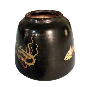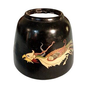 Antique Japanese Phoenix Black Lacquer On Wood Small Vase Pot.