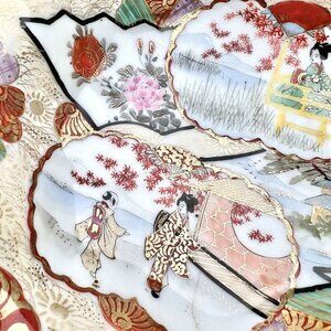 Hand-painted Kutani porcelain bowl with scalloped edges and footed base. Traditional geisha and floral scenes in a rich multi-color palette. Displays beautifully despite minor flaws (see photos).