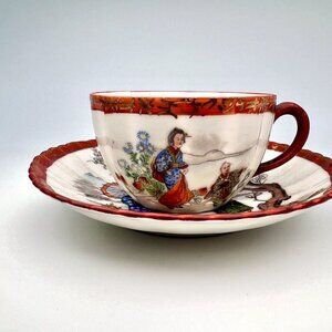 Antique Japanese Kutani Porcelain Teacup & Saucer Set Hand-Painted - Geisha Ware