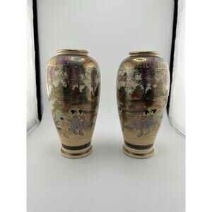 This pair of 7.5" vases is a true treasure from the late 19th to early 20th century, specifically the Mejii Period in Japan. Made of porcelain and pottery, they showcase intricate details and vibrant colors typical of this era. Each vase is signed, adding to their authenticity and value. Perfect for collectors of Asian antiques or those with a love for vintage decor, these vases are a beautiful representation of Japanese craftsmanship and artistry from 1850-1899. They are hand painted with geishas and country scenes. They are heavily gilded. They are in very good condition with no chips. There is some minor crazing in the gold bands at the base. Please examine all the photos. These are estate pieces and have wear consistent with being over 100+ years old. They are 7.5" tall, 3.5" wide at the thickest part.