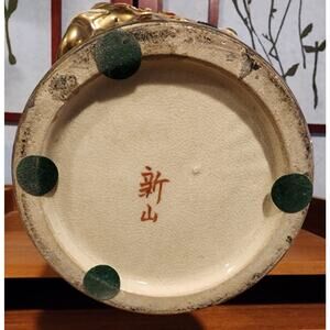 Stunning hand painted porcelain vase with intricate detail, decorated with three-dimensional dieties. Deep rich colors and patterns with gold gilding. Please note that the trunk on the elephant may have been repaired. Hard to see at first, there is a close-up photo that shows this. There is paint wear and a couple minor scratches. Signed. Approx 12" H x 7.5" W