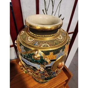 Antique Japanese Satsuma Moriage Relief Vase with Elephant 12"