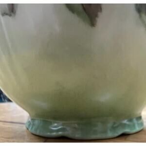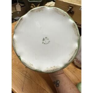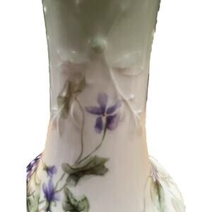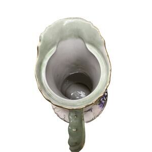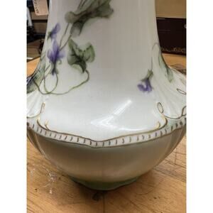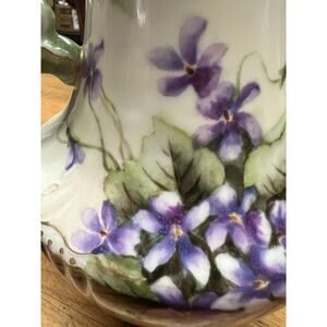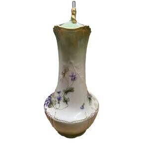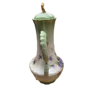 This antique Jean Pouyat chocolate pot is a exquisite piece of porcelain artistry from Limoges, France. The pot features a beautiful floral pattern with gold gilt accents, adding a touch of elegance to any kitchen or dining room.