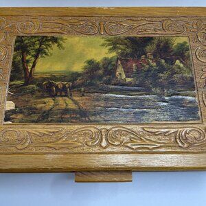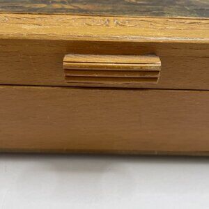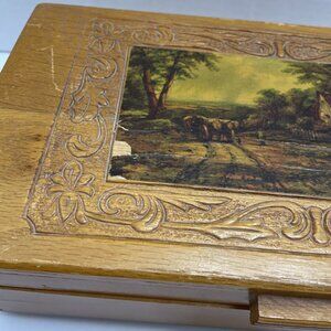 Antique Jewelry Keepsake Wood Box Mirror Carved Landscape Litho Dovetail (READ)