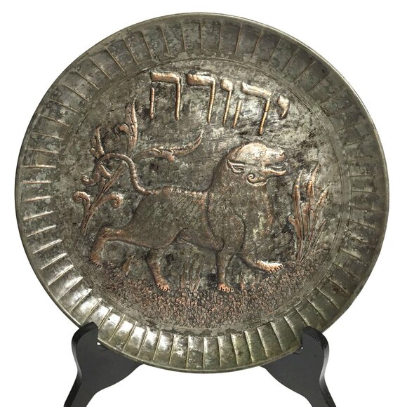 Antique Judaica Brass & Copper Plate Hand-Etched Hebrew Script "Yehuda" Lion