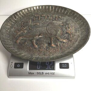 Antique Judaica Brass & Copper Plate Hand-Etched Biblical Scene Hebrew Script "Yehuda" Lion