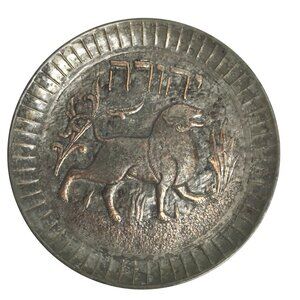 The design depicts a majestic lion, surrounded by symbolic flora and the Hebrew inscription "Yehuda"—a reference to the biblical tribe of Judah, one of the Twelve Tribes of Israel.