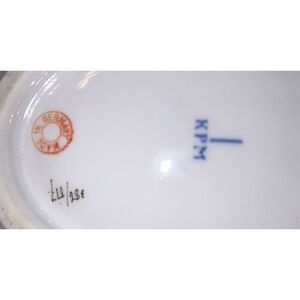This antique serving bowl from KPM Germany features a beautiful floral pattern with gold detailing throughout the piece. It is an original piece, measuring 12 3/4 inches in length and 9 inches in width. The backstamp is painted and the item is made of porcelain.  There is some fading on the gold but no chips or cracks, in overall good vintage condition. This is a numbered piece made in Germany and weights 1.7 pounds. This is a rather shallow bowl.