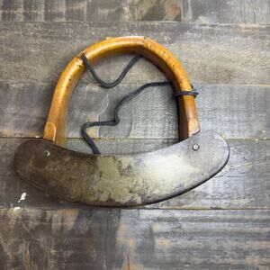 This is an antique kitchen vegetable chopper with a wooden handle and rocker blades. It's a wonderful piece of primitive farmhouse kitchenalia that would make a great addition to any collection or a unique decorative item for your kitchen. This hand chopper is in good condition for its age, with some signs of wear that add to its vintage charm. It's ready to chop or display!