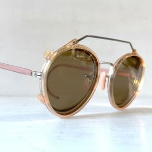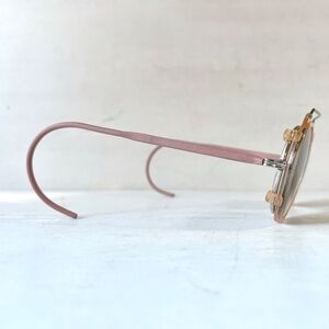 Fitted with a pair of pre-owned peach plastic rimmed sunglass clips with oregano green glass lenses from the same era.