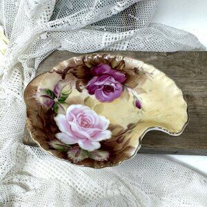 Antique Lefton China Rose Shell Dish With Pink & Purple Floral Design
