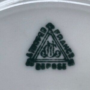 Fine French Limoges porcelain with shaded café-au-lait ground and hand-painted oak leaves and acorns, outlined in chocolate and finished with a thin gilt rim. Triangular “Limoges – France – Déposé” underglaze mark; artist’s signature on the face. A lovely Art-Nouveau/forest-forage motif for fall display.