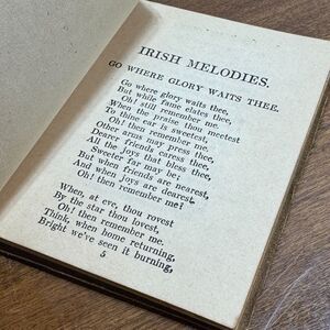 The Antique Little Leather Library Book "Irish Melodies" by Thomas Moore features a green cover and was published in the 1900s.