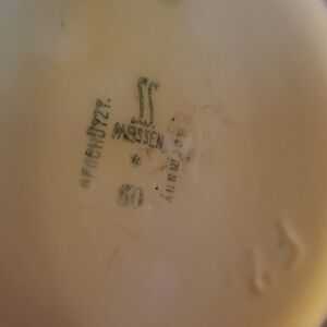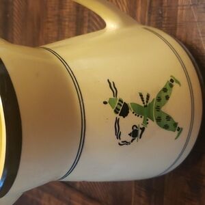 Antique yellow with black banding. Butler with tea pitcher in green clothing very rare. 7 inch tall. Slight crazing. Crack at the bottom that does not go through to the outside on the bottom as pictured in picture 4.