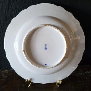 Some light wear on gold accents. There are two lines scratched through the Meissen mark -there is paint transfer on the back of the plate.