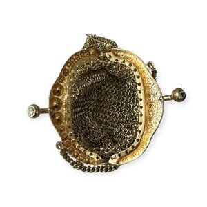 A gold-tone chain mail mesh tiny bag with an ornate gilt brass frame with delicate floral scrollwork and embedded rhinestones.