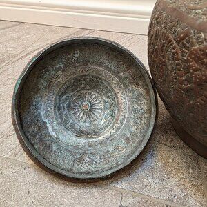 This Antique Middle Eastern Persian Qajar Handmade Tin Cooper Kettle Coffee Tea Pot is a beautifully crafted teapot made of copper, originating from the Middle East. Its handmade design and antique originality make it a unique and traditional piece for serving coffee or tea. The intricate details and historical significance of this teapot make it a valuable addition to any collection of Asian antiques or Middle Eastern artifacts.