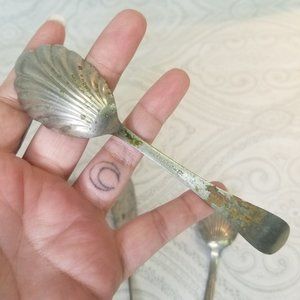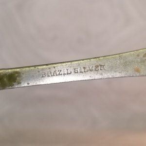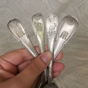 This is an antique, partial set of personalized initial silver-plate flatware by Brazil Silver. This pattern is "BZS72" which features beaded, scrolls, plume design. They show obvious signs of wear from age, use, and storage as there is discoloration and patina. However, none are bent or cracked. You will receive 2 sugar shell spoons (one monogrammed with H, the other M) that are approximately 5⅞" long, one twisted handle butter knife (M), and one place/oval spoon (M) that are 7" long. They are stamped with "Brazil Silver" on the undersides.