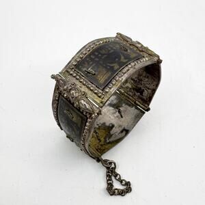 Details: Antique early 20th century genuine Moroccan Berber / Amazigh sterling silver cuff bracelet featuring four inlaid enamel panels depicting Islamic mosque motifs. Likely crafted in the coastal Tiznit region, known for its historic Amazigh silversmithing. Detailed with ornate hand-etched and filigree silverwork and finished with a traditional sliding pin closure. Collectible, artisan-made, and culturally significant North African tribal jewelry. Unmarked.
