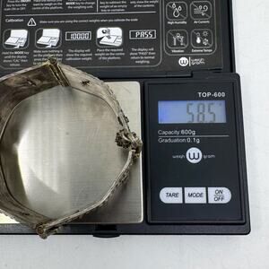 Condition: Good antique condition. Heavy patina and tarnish consistent with age and wear; cuff is slightly out of round. Pin closure functions properly – see photos.