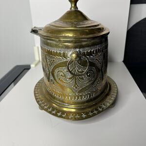 Very beautiful old tea caddy with hand engraving, old but functional hinge, and feet. Was previously used to hold potpourri so may have a slight cinnamon scent when it arrives (it's pleasant and subtle and will probably be gone by the time this sells.)