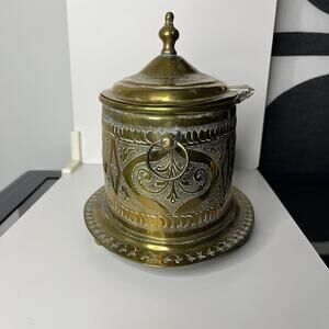 Rare find with this early 1900s Moroccan tea caddy. Made from brass (with some possible pewter or copper), it has a hand etched design on the front and back, hammered rim, and hinged lid with round feet.