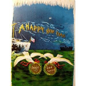 Antique New Years Postcard Ship Boats Harbor Seagulls Peace God Speed Series 209