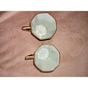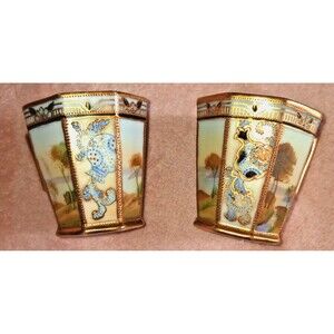 These Antique Nippon Hand Painted Porcelain Chocolate Cups are a charming set of two round cups originating from Japan. The cups feature a beautiful trees pattern in multi-color, hand painted on glossy bone china material. Marked with gold gilt, these vintage cups are sure to add a touch of elegance to any drinkware collection with their antique original design. Perfect for serving hot chocolate in style, these Nippon cups are a unique and decorative addition to your home.